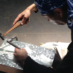 The artist Tachibana endeavors to bring out the true qualities of tin while adding an artistic touch.