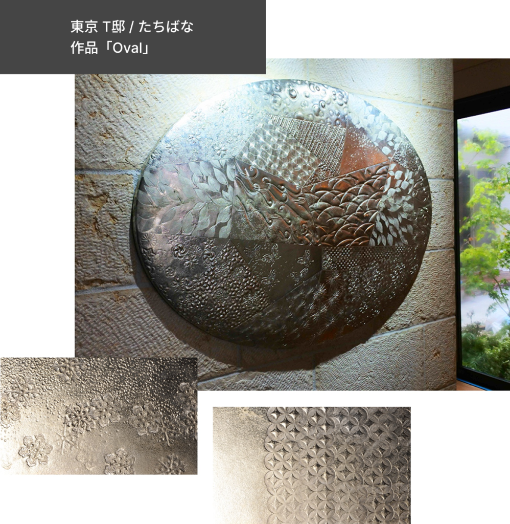 Thanks to the collaboration of the artist, Tomoya Tachibana, Moonlight offers a new line of interior decorating material called “Tachibana”. The artist utilizes a special forging technique called “ayauchi” to form intricate patterns on the tin tiles, creating a world of enchantment and beauty.