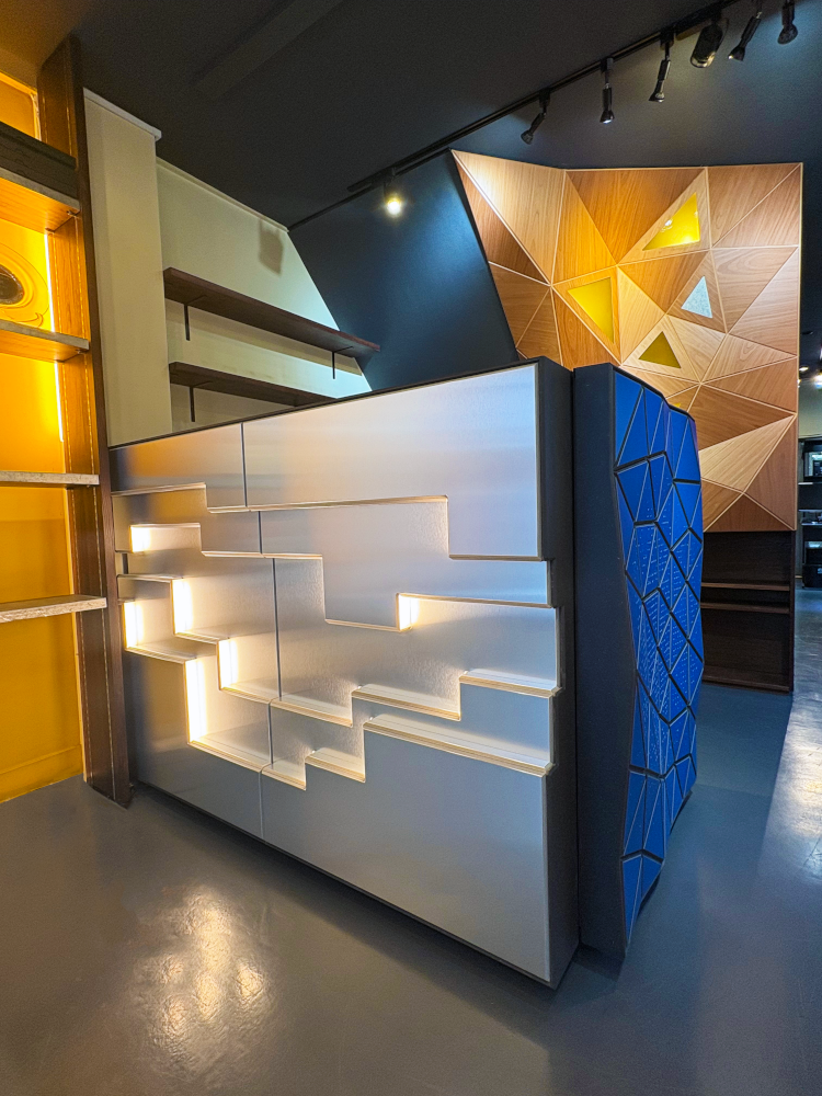 壁面・天井・什器など様々な場所へ適用することができるため、空間全体のトータルコーディネートを実現します。照明器具や音響効果オプションを組み込める品番もあり、独自の空間表現が可能です。