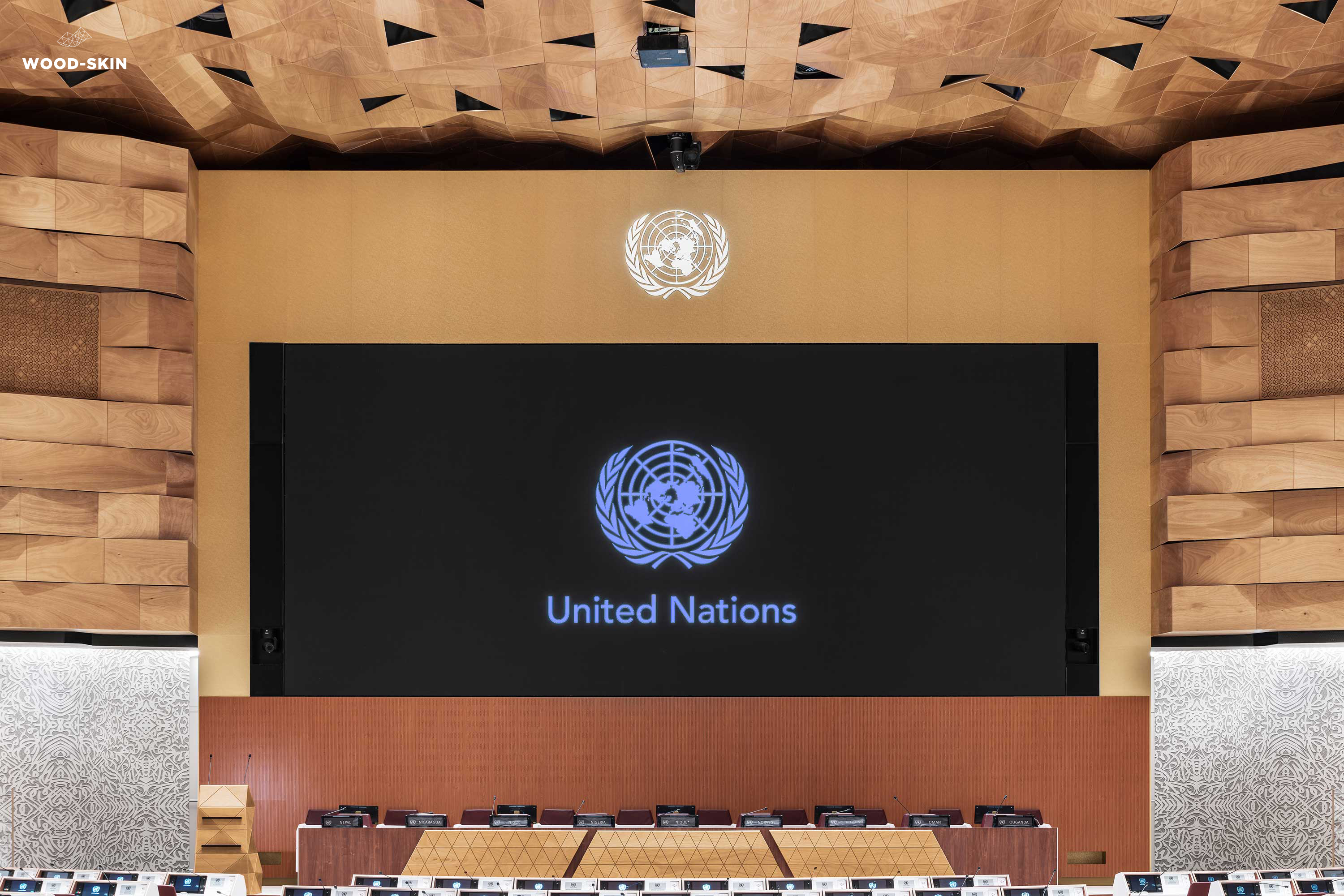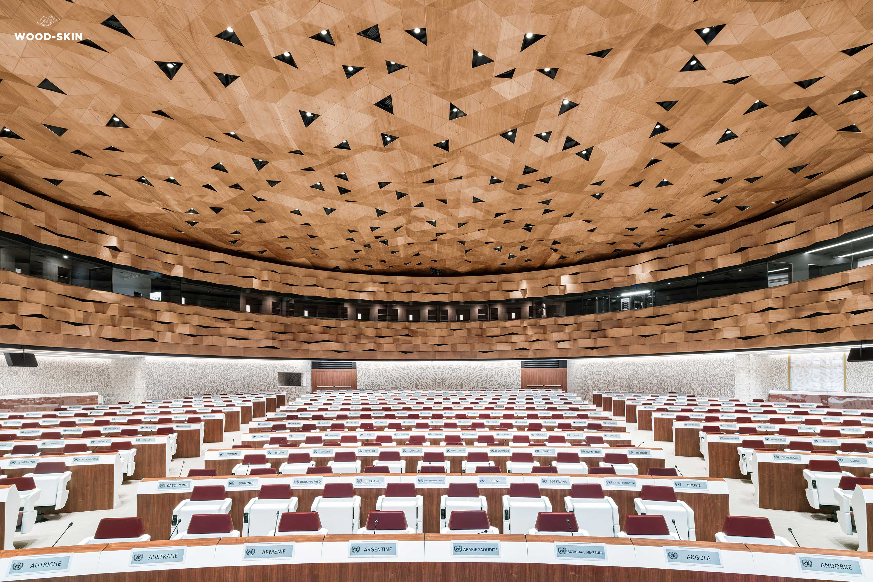 天井は砂丘の絶え間ない動きを想起させ、照明システムは日の出と日没の概日リズムを反映し、壁面の波状パネルは円形空間の音響最適化に応じて形状パターンを変化させつつ、平和と外交の促進・支援という国連の使命を象徴的に表現しています。